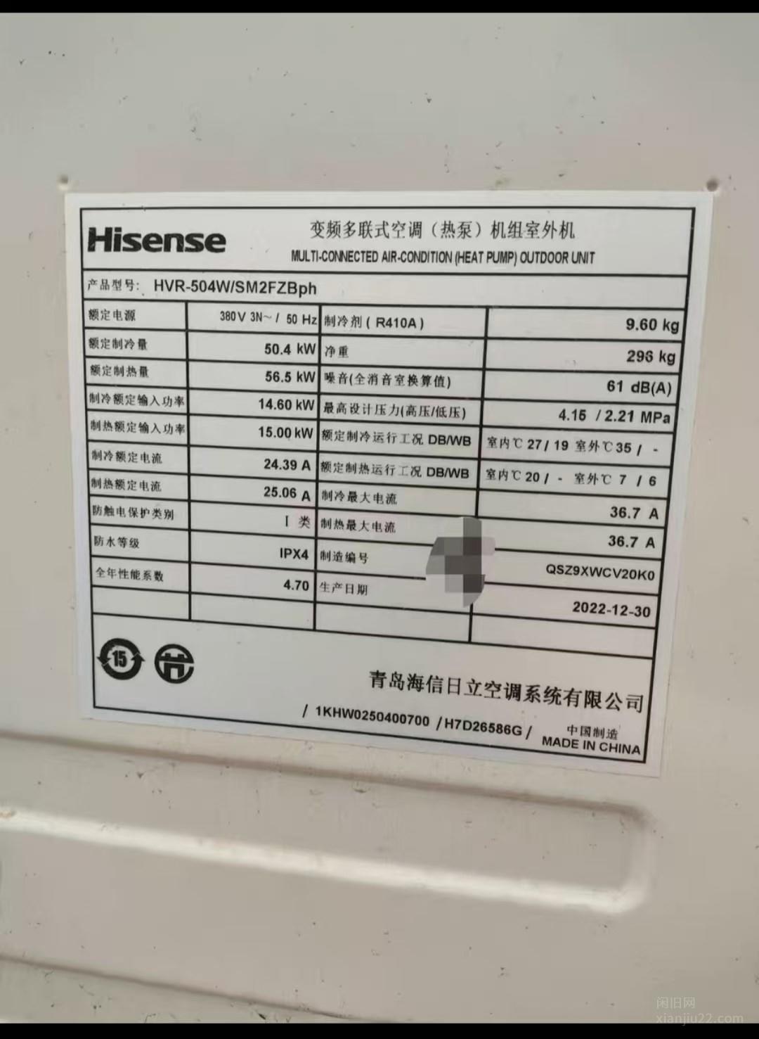 -中央空调室外机,海信M2系列中央空调室外机,504型号,18匹大功率,22年12月生产,几乎全新。制冷50.4kW,制热56.5kW,一级能效变频,超级省电。机器保养很好,外观完整,功能完好。适合200-350平米场地使用,支持上门看货。北京市房山区自提,价格可议,欢迎咨询具体细节。2.8万 有意者电联!