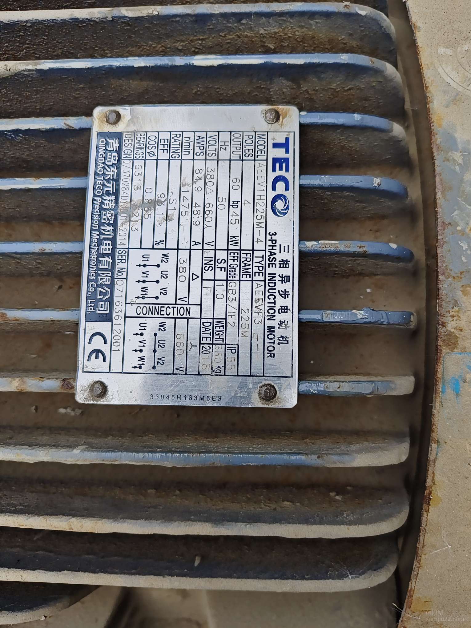 出售三相异步电动机,MOde:AEEV1H225M-4(60hp,50HZ,45KW,),Type:AEEVF3(1475r/min)