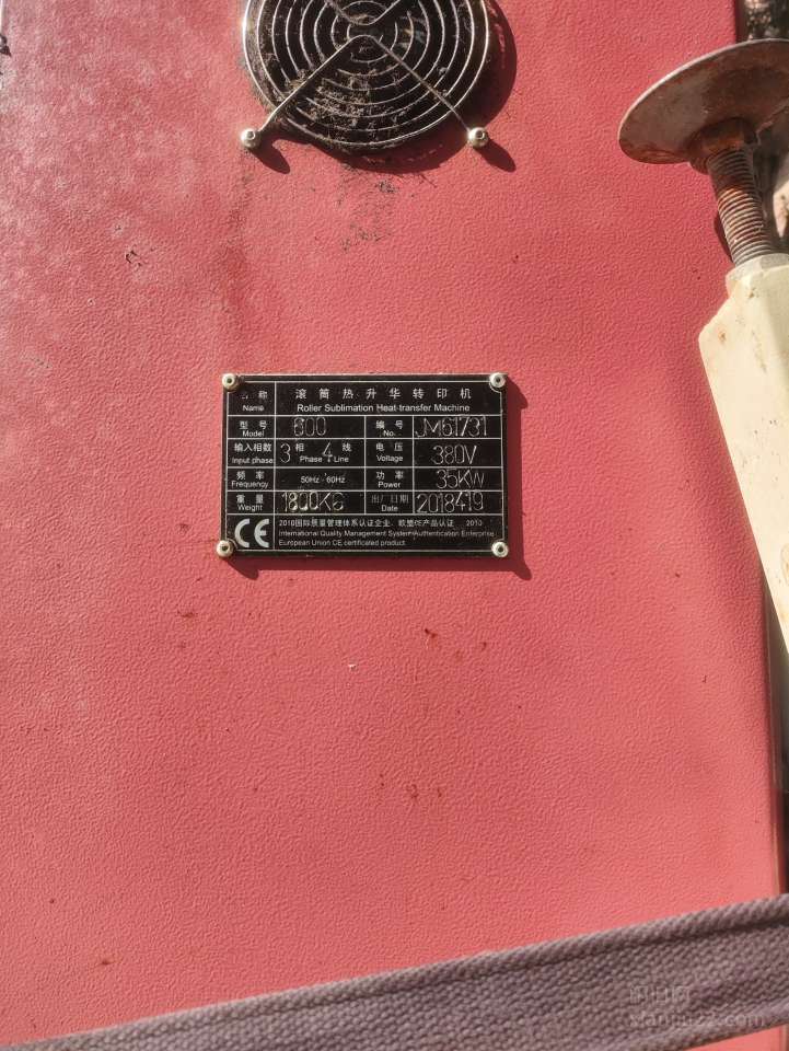 佳明滚筒热升华转印机,型号800,380V三相四线,功率35KW,重1800KG,2018年出厂,铭牌参数齐全,机器成色正常,有使用痕迹,功能完好。