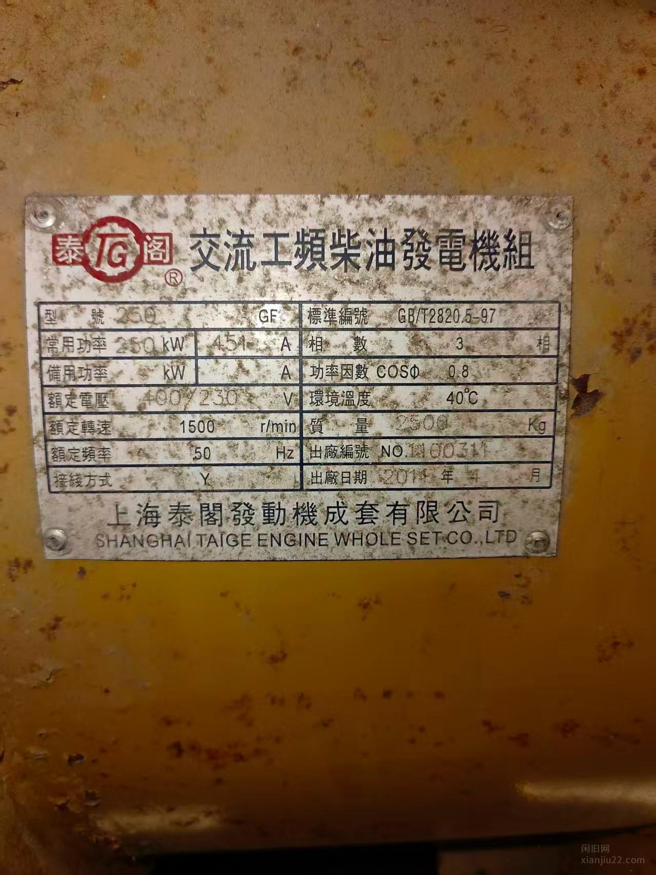 整厂拆迁商14年上海泰阁250千瓦柴油发电机组一台,浙江宁波在位处理14年上海泰阁250千瓦柴油发电机组一台,大公司设备,少用,保养挺好,感兴趣联系。 有意者电联!
