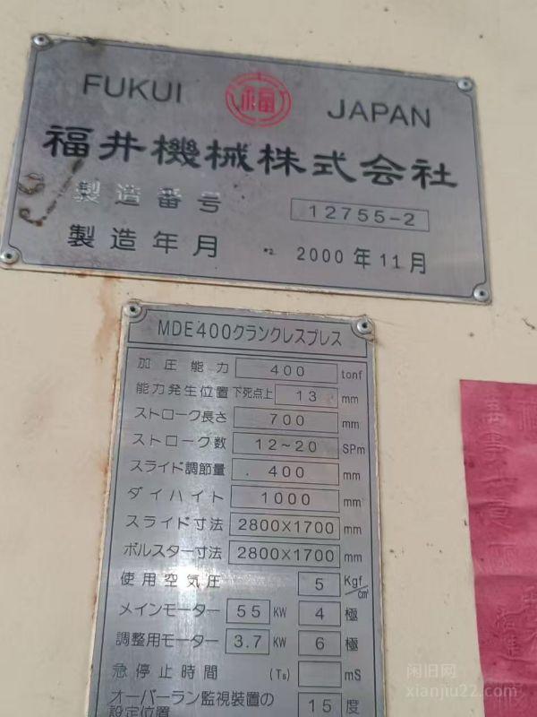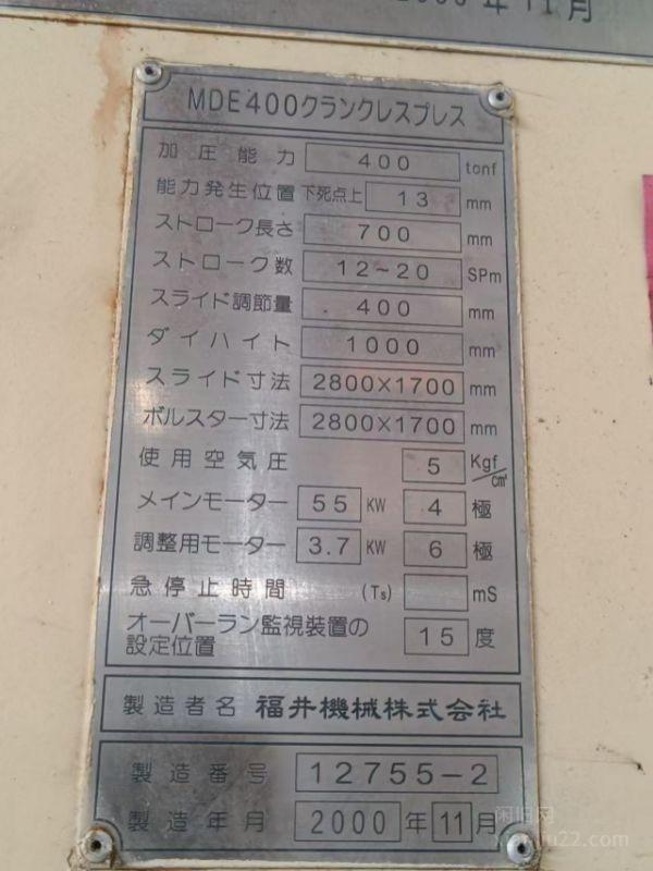 日本福井机械株式会社生产的MDE400型无飞轮压力机(日文:MDE400クランクレスプレス),属于工业冲压设备