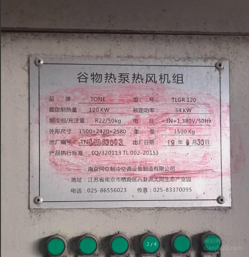 1、谷物热泵热风机组,TONE品牌,型号TGRL 120,制冷量120KW,三相380V,带控制面板和压力表,参数齐全,具体看铭牌。设备成色还可以,功能正常,适合谷物烘干、粮食加工用。 2万元