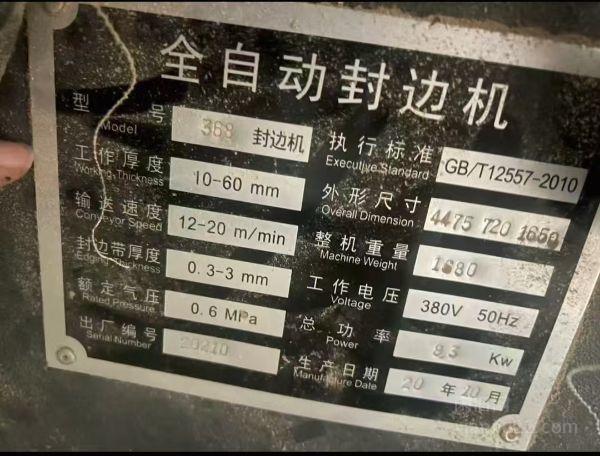 适合板式家具、橱柜批量加工,操作简单,效率高,动力足,三相电,10-60mm板厚都能用,输送速度12-20m/min,封边带厚0.3-3mm,气压0.6MPa,总功率9.5kw,生产日期2020年10月,出厂编号20210。
