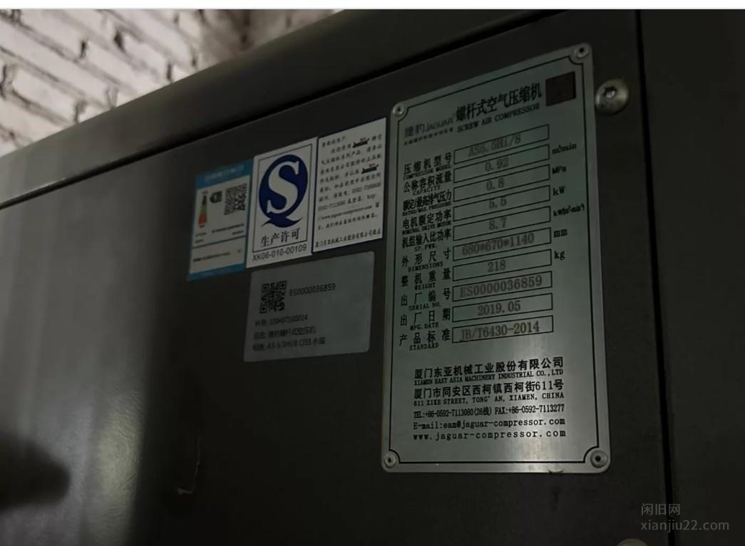 捷豹空压机5.5kw变频高配, 出气量0.92立方比杂牌7.5kw强的多,超一级能耗,购买日期2022年 8月 17,铭牌生产日期2019年,