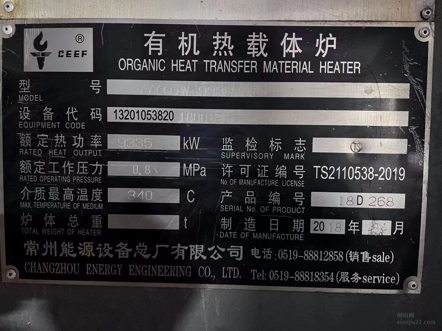 出售2018年8月常能800万燃气导热油炉,配套欧宝30mg燃气燃烧器,余热锅炉,空气预热器,鼓风机,FGR风机,闭式油槽一对,电控,3只油泵,货在常熟,春节刚停炉价格45万,有意者电话联系