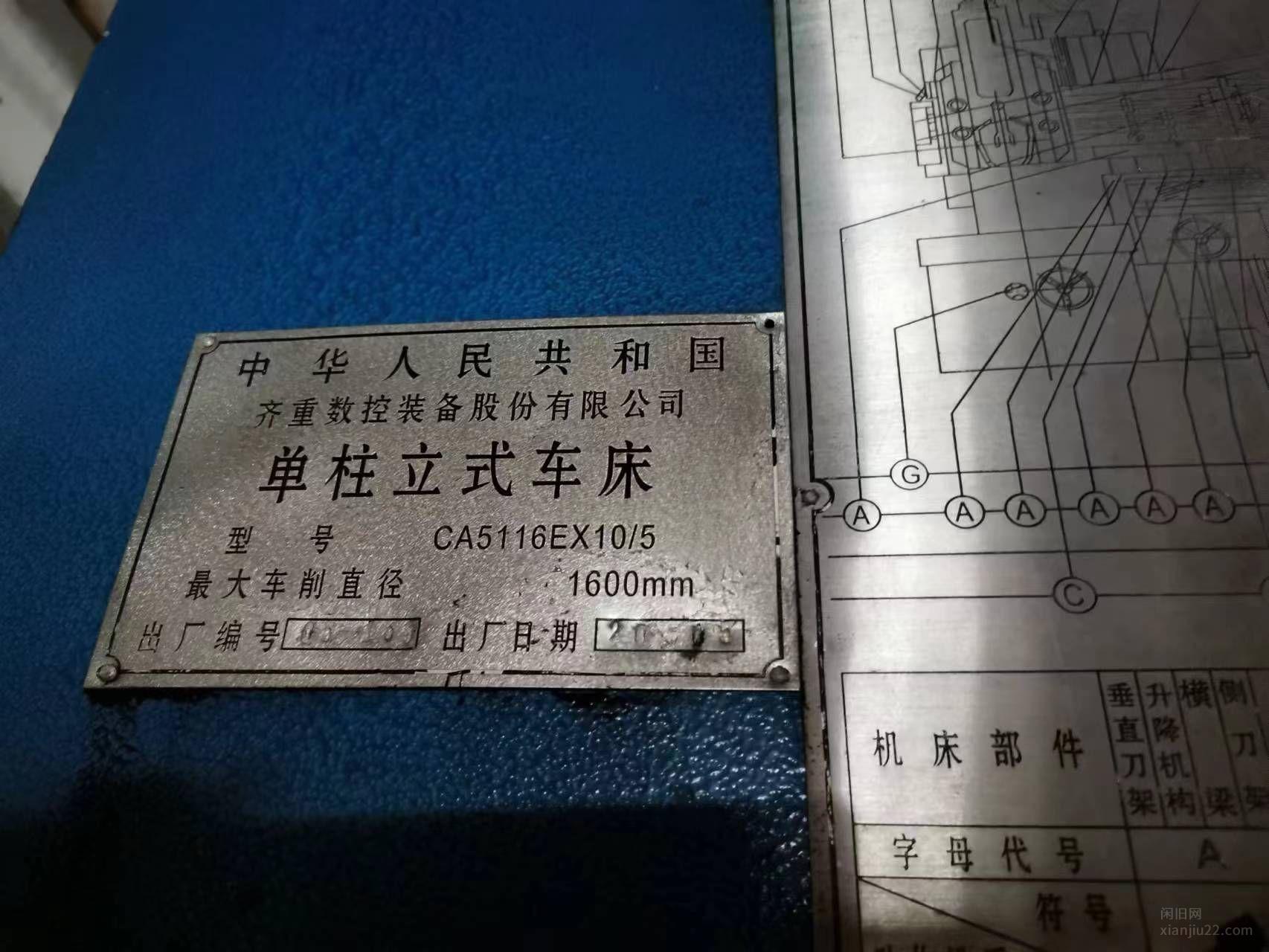 出售齐重CA5116EX10/5单柱立式车床,18万,有意者电话联系。