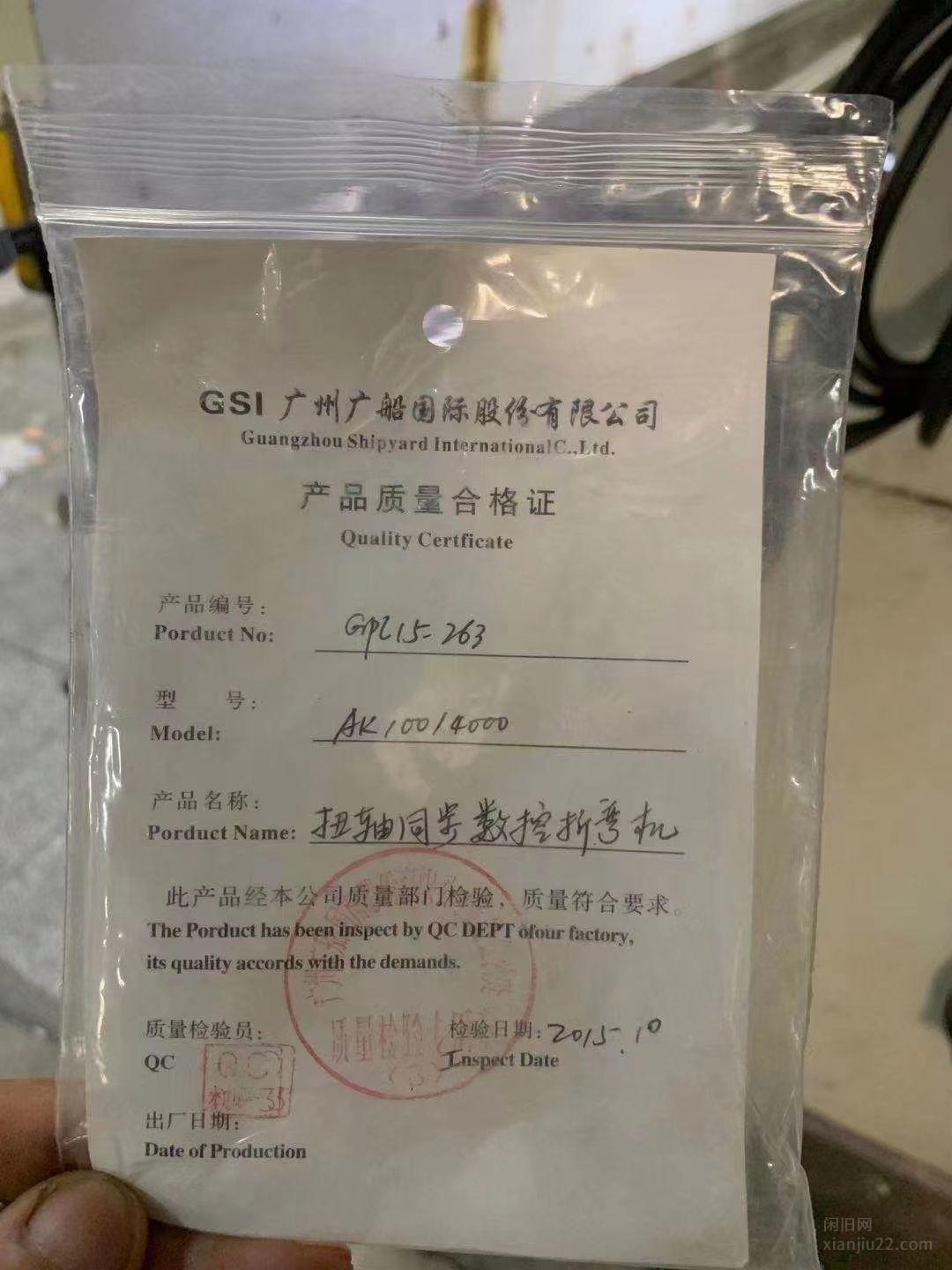 出售广州广船AK100/4000折弯机,价格10.5万,有意者电话联系。