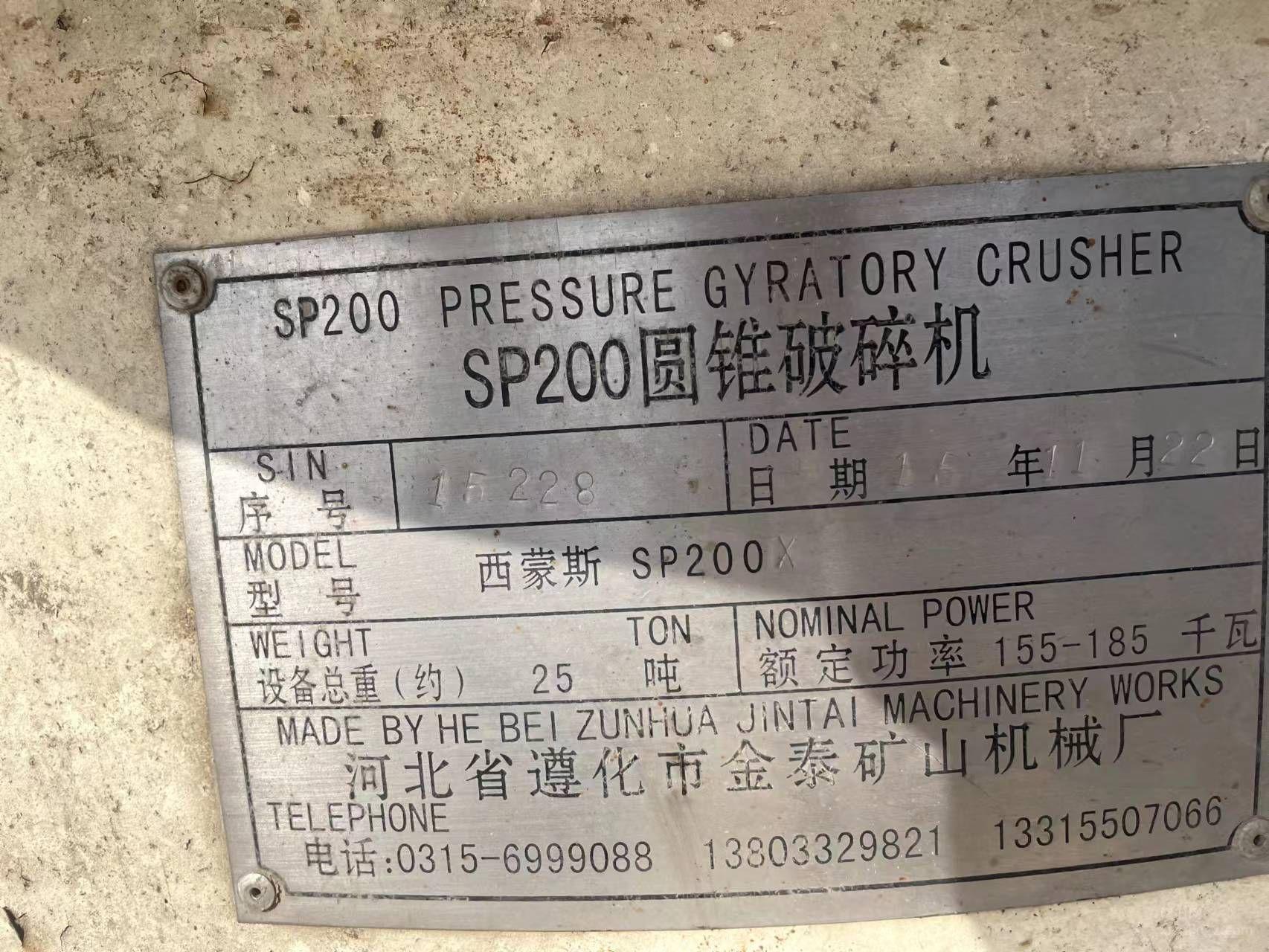 出售15年11月22日 西蒙斯SP200 圆锥破碎机 设备总重25吨、配160KW电机