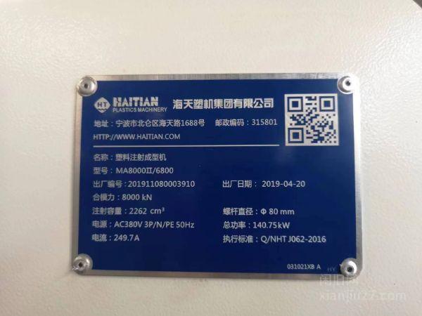 19年800T海天注塑机 螺杆80 注射容量2262cm3,