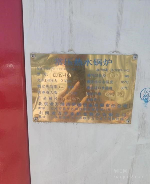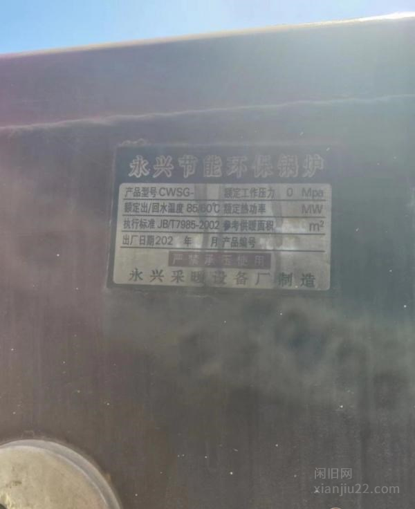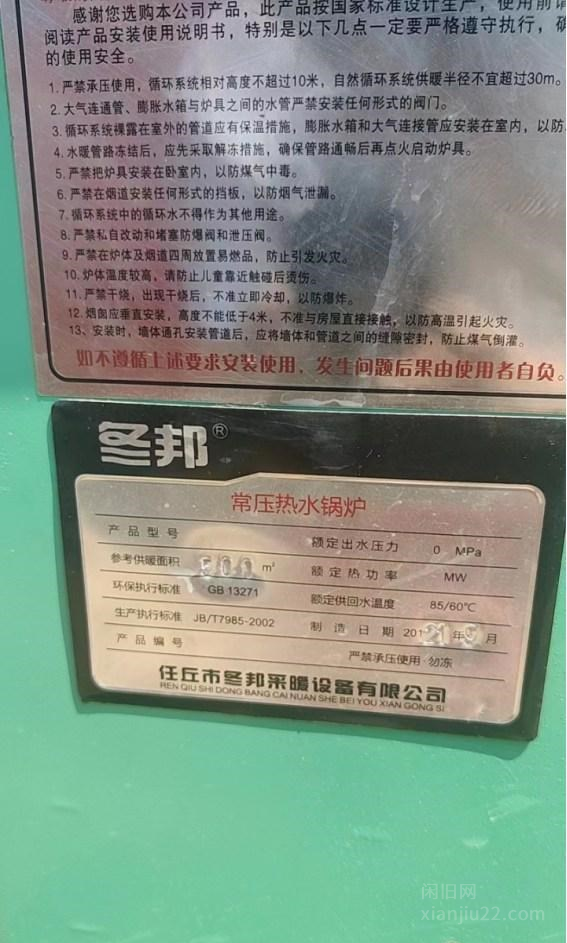 2018年老万牌常压热水锅炉一台,配件齐全,七成新,型号:CLHS-14额定热功率14MW,供暖面积20000平。2021年永兴节能环保锅炉两台,配件齐全,九成新,型号:CWSG-参考供暖面积4000㎡。2021年冬邦常压热水锅炉一台,配件齐全,九成新,参考供暖面积500㎡。