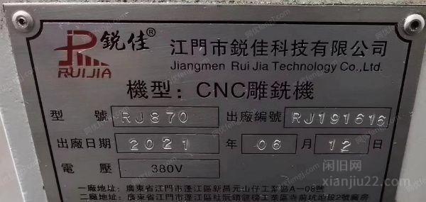 经营不善,转让闲置21年CNC雕铣机RJ-870,主轴BT 40,瓦数7.5千瓦,系统,台湾新代,22MA
