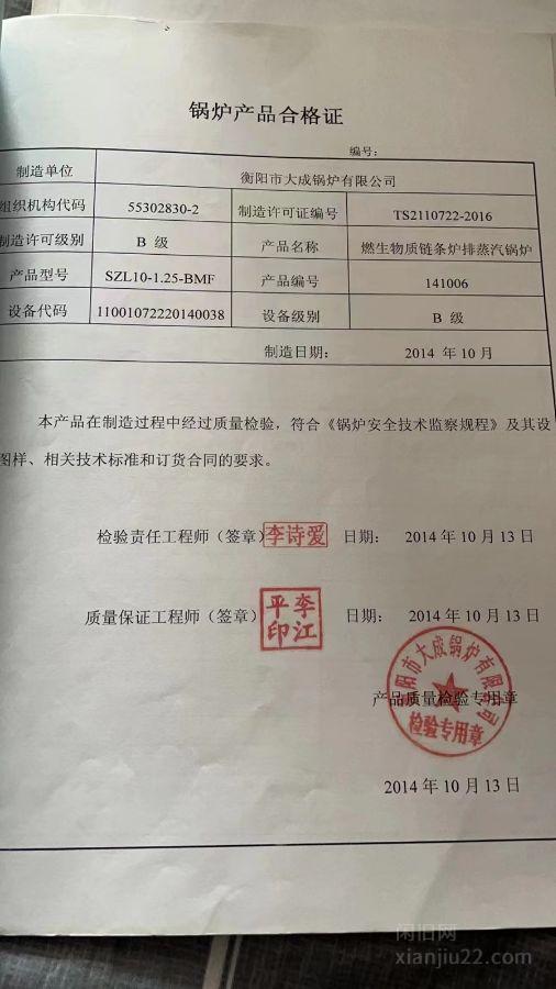 出售衡阳大成10吨生物质颗粒蒸汽锅炉