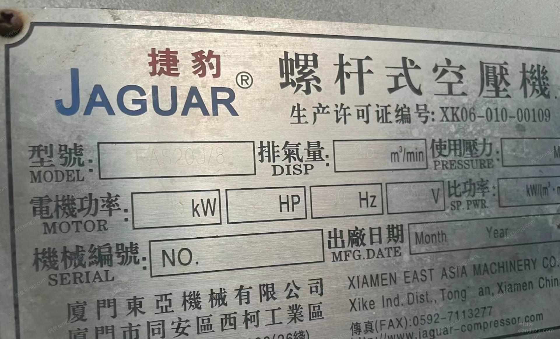 出台湾捷豹品牌的螺杆式空压机,功率:15kw颜色为灰色,该机器已使用过,现闲置处理。
