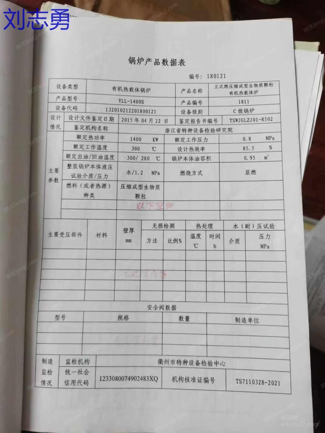 _120万大卡生物质导热油锅炉,手续配件齐,低价出售,120万大卡生物质导热油锅炉,手续配件齐全,移装证明已经办理。 有意者电联!