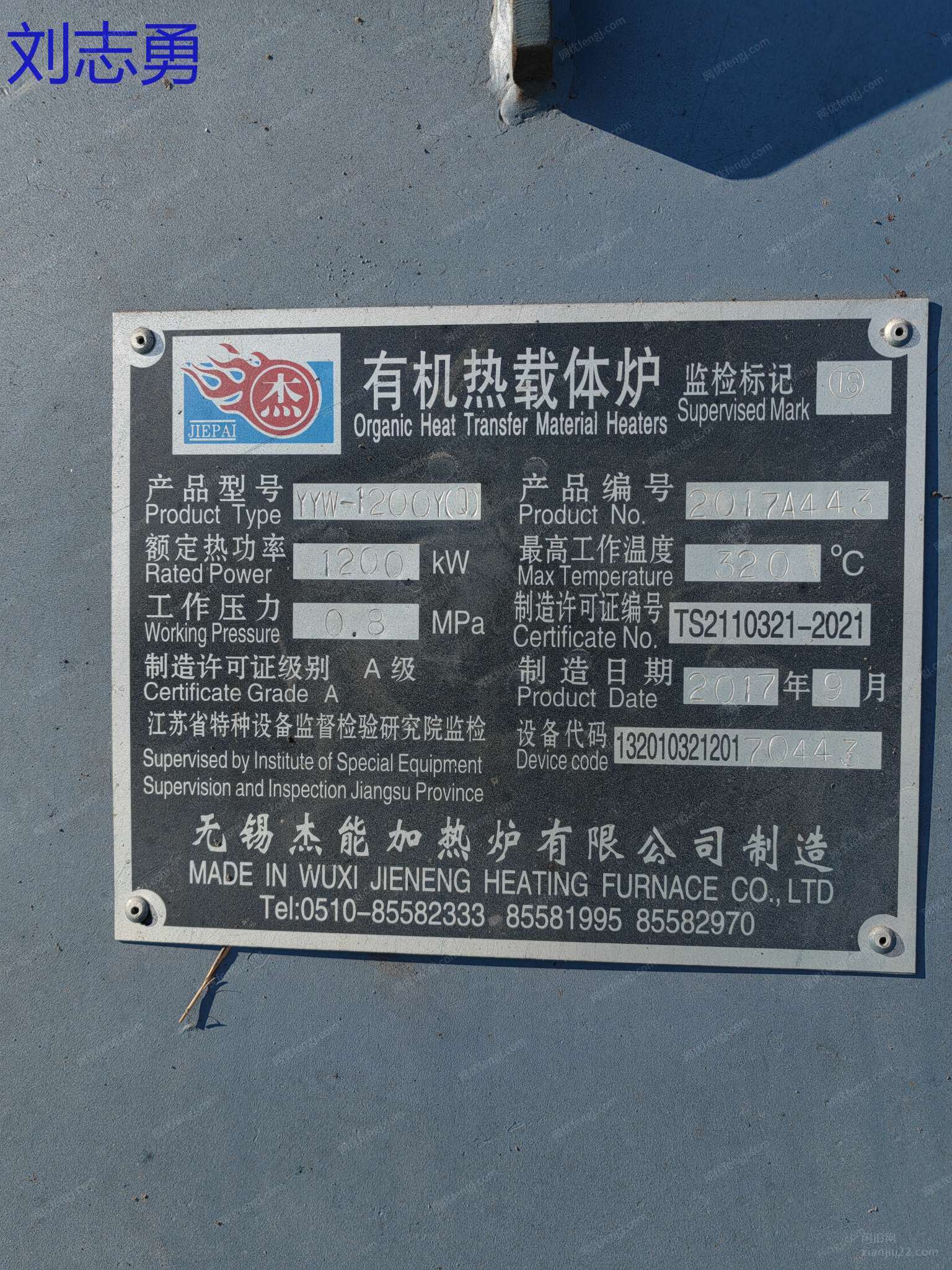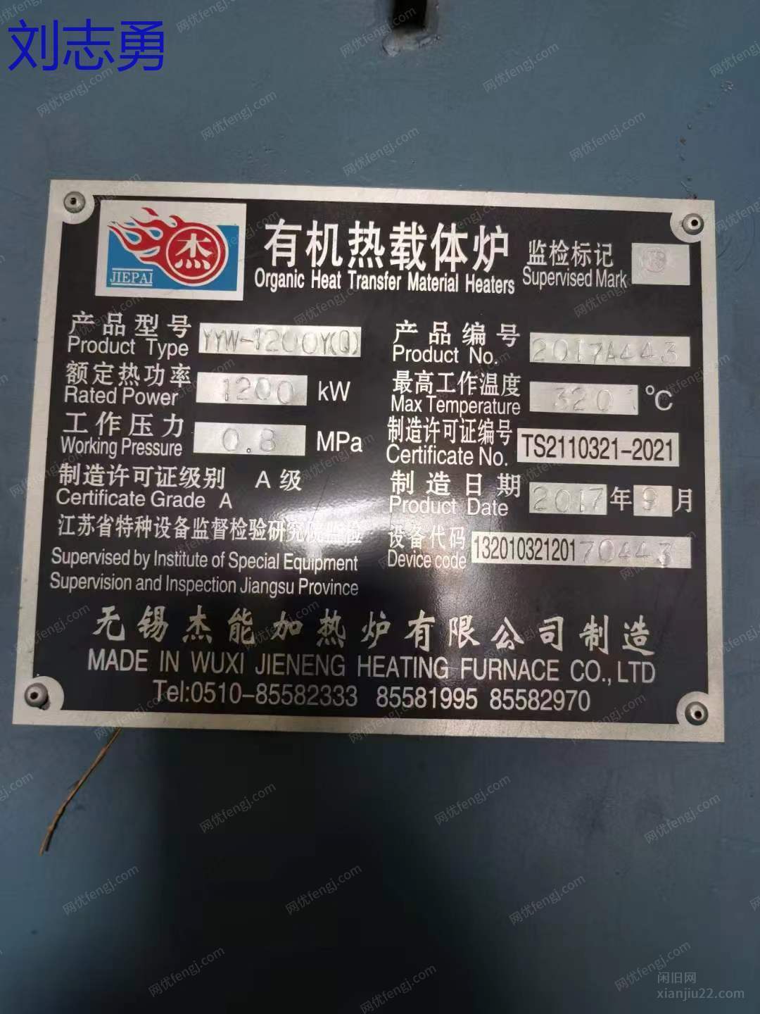 无锡杰能锅炉,100万大卡燃气导热油锅炉,未使用过,手续配件齐全。