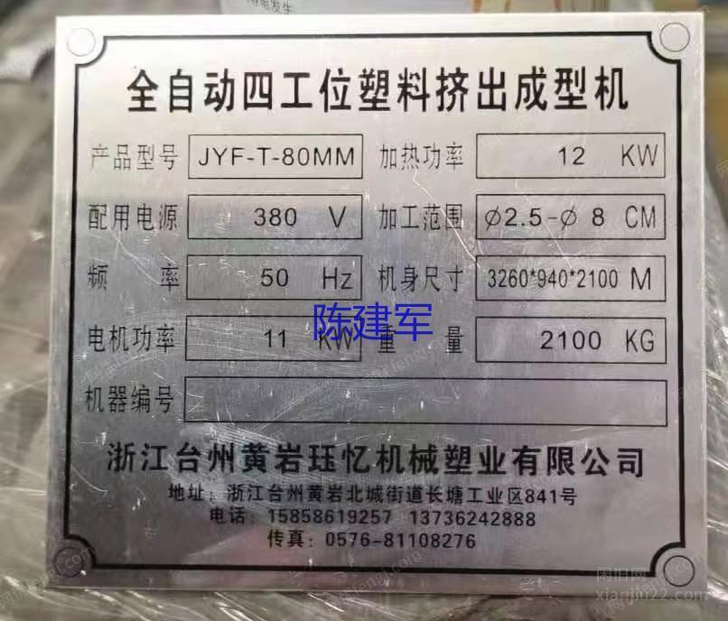 JYF-T-80MM型二手80全自动四工位塑料挤出成型机一台,浙江省台州市黄岩南城药山创业园B区1-09现货供应二手80全自动四工位塑料挤出成型机一台,JYF-T-80MM型,感兴趣联系。 有意者电联!
