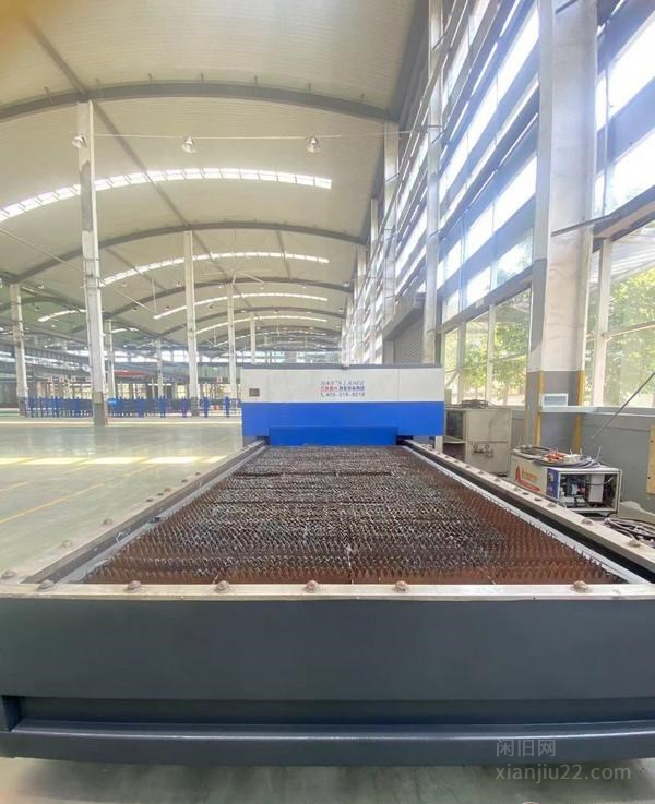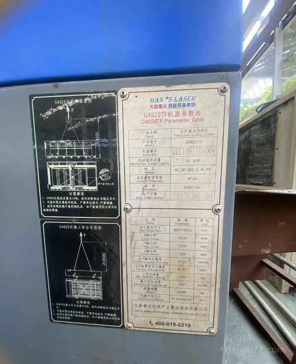 大族光纤激光切割机,型号:G4020FT6000W年份:2017加工板材尺寸:4000*2000X轴行程:4030Y轴行程:2020Z轴行程:120工作台承重:1600大定位速度:169机器重量:14000机器外形尺寸:11.2*3.5*2.0