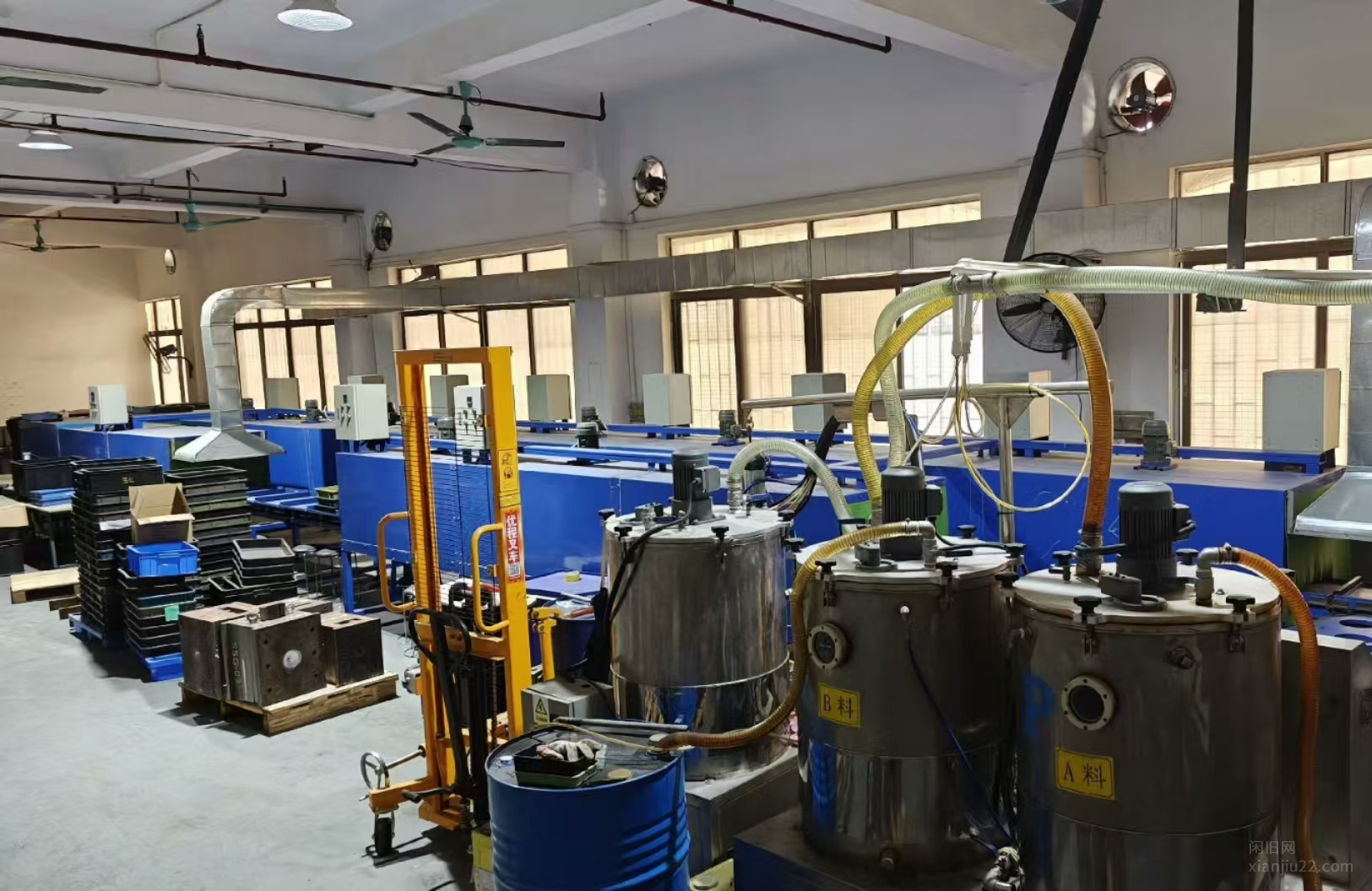 9成整个车间PU生产线设备打包,电动叉车,16米环型烤箱, A,B胶灌注设备,各种切边机台!脱模机等!