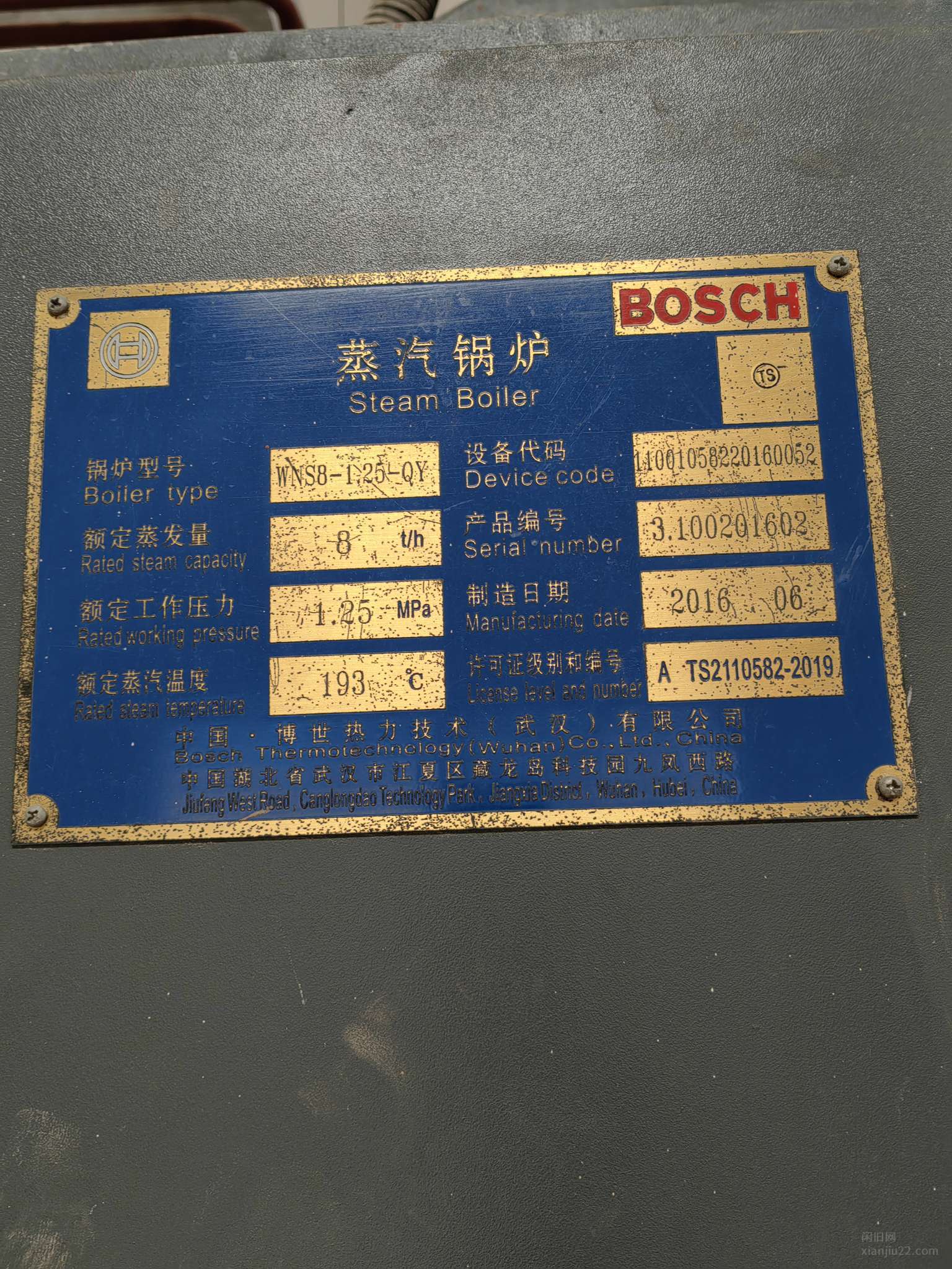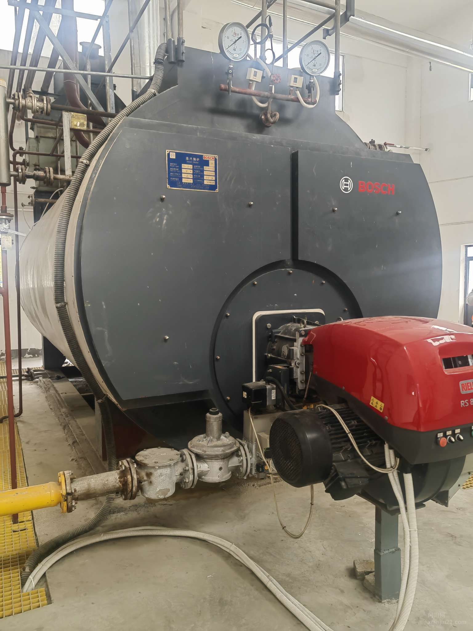 武汉博世热能科技有限公司,8吨燃气蒸汽锅炉,13公斤压力,手续配件齐全,锅炉9成新,移装证明已经办妥。
