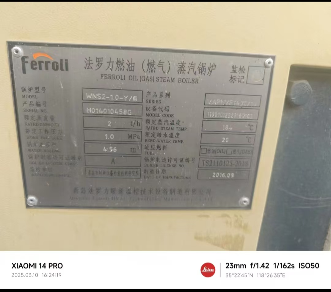 WNS2-1.0-Y/Q闲置Ferroli2吨燃气锅炉出售,出售2吨燃气锅炉,品牌是Ferroli,型号WNS2-1.0-Y/Q,2016年制造,功能完好无维修。设备闲置少用,保养良好。2万 有意者电联!