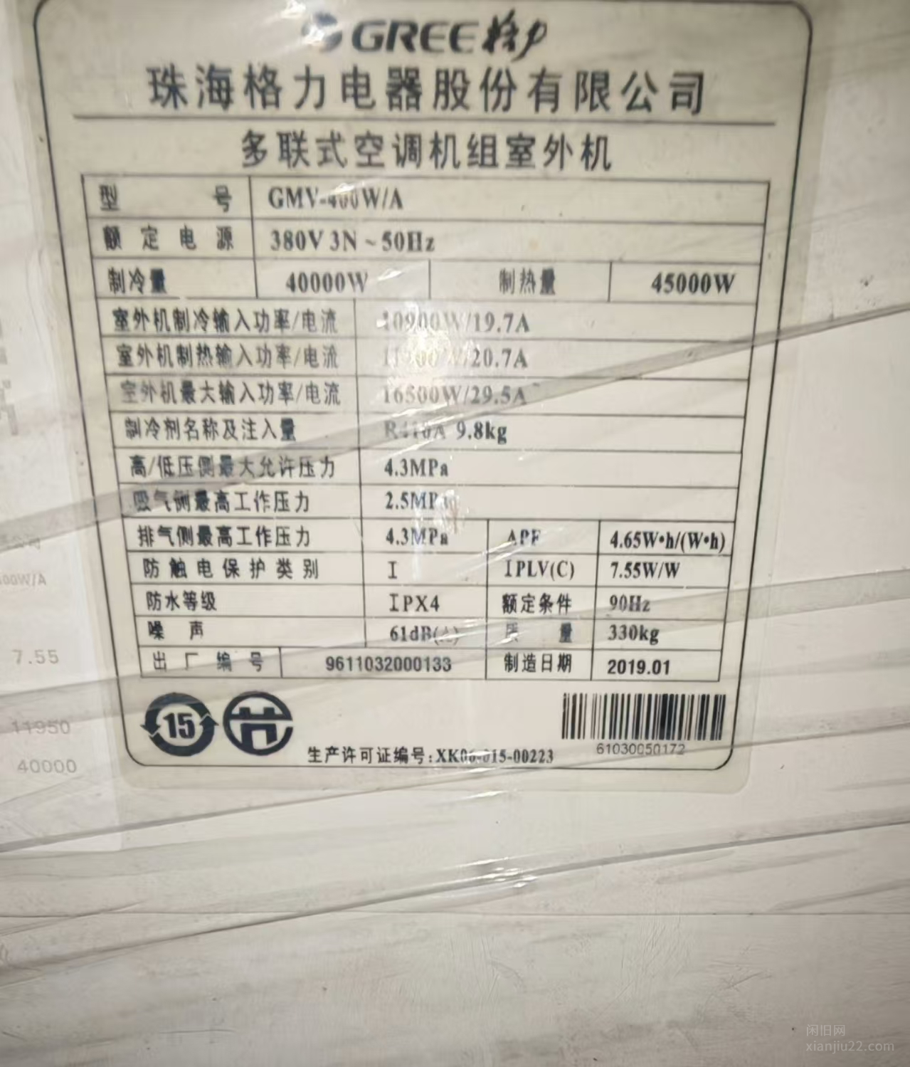 格力多联式空调机组室外机,型号GMV-400W/A,2019年出厂。制冷量40000W,制热量45000W,380V三相电源,工作电流不超过19.7A和20.7A,噪音仅61dB,运行安静。使用R410A制冷剂,充量9.8kg,压力最高4.3MPa,IPX4防水。质量330kg,功能完好无维修。