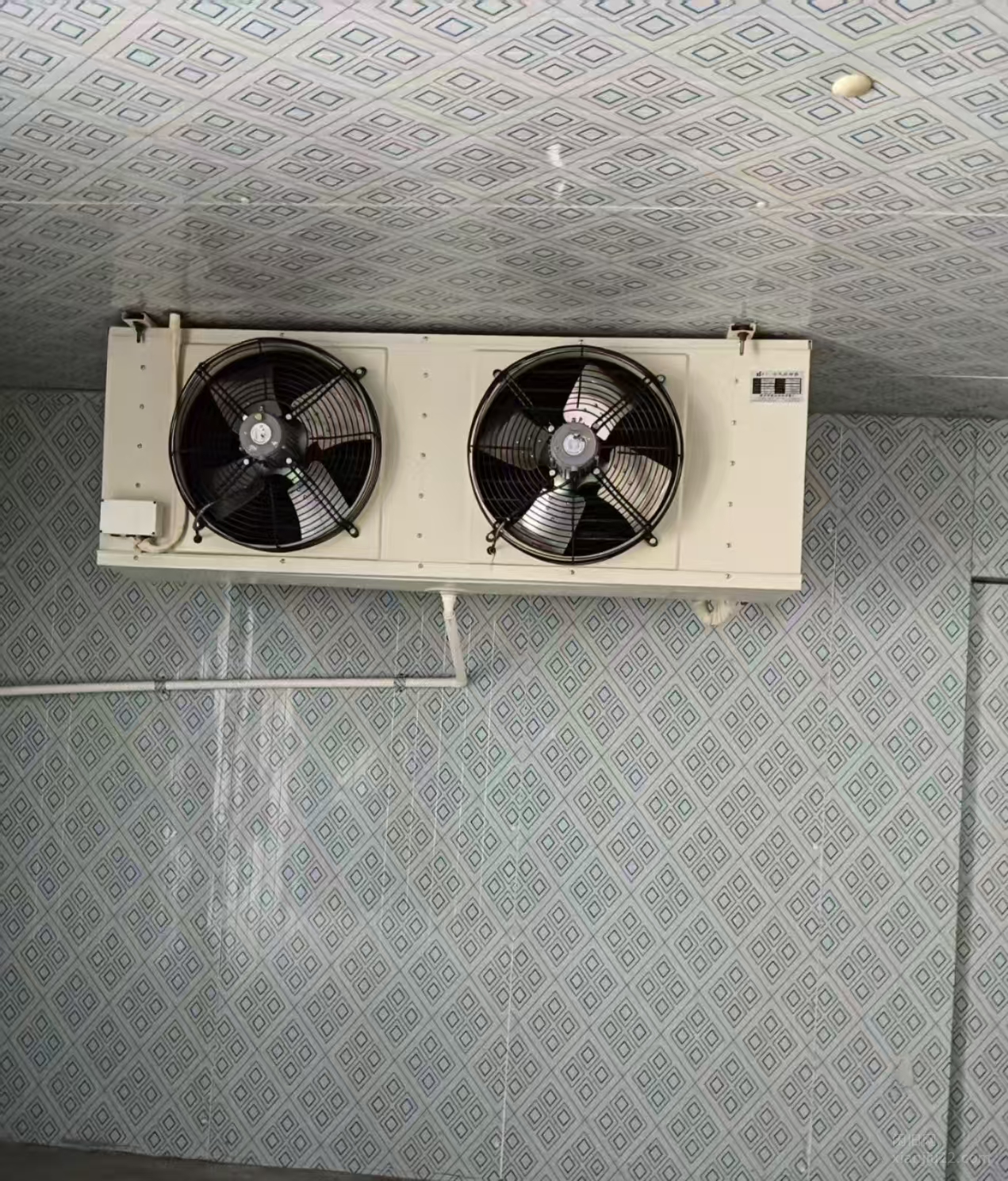 冷库制冷机组设备出售,包含两台大风扇,功能完好无维修。一处位于车间外墙,