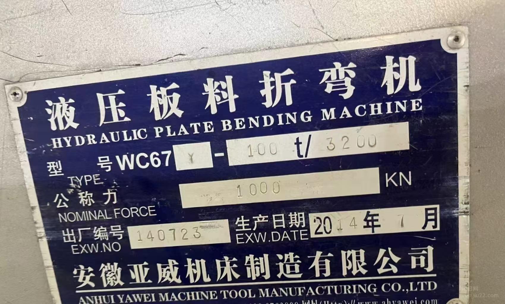 河南郑州出售14年安徽亚威折弯机100吨×3.2米