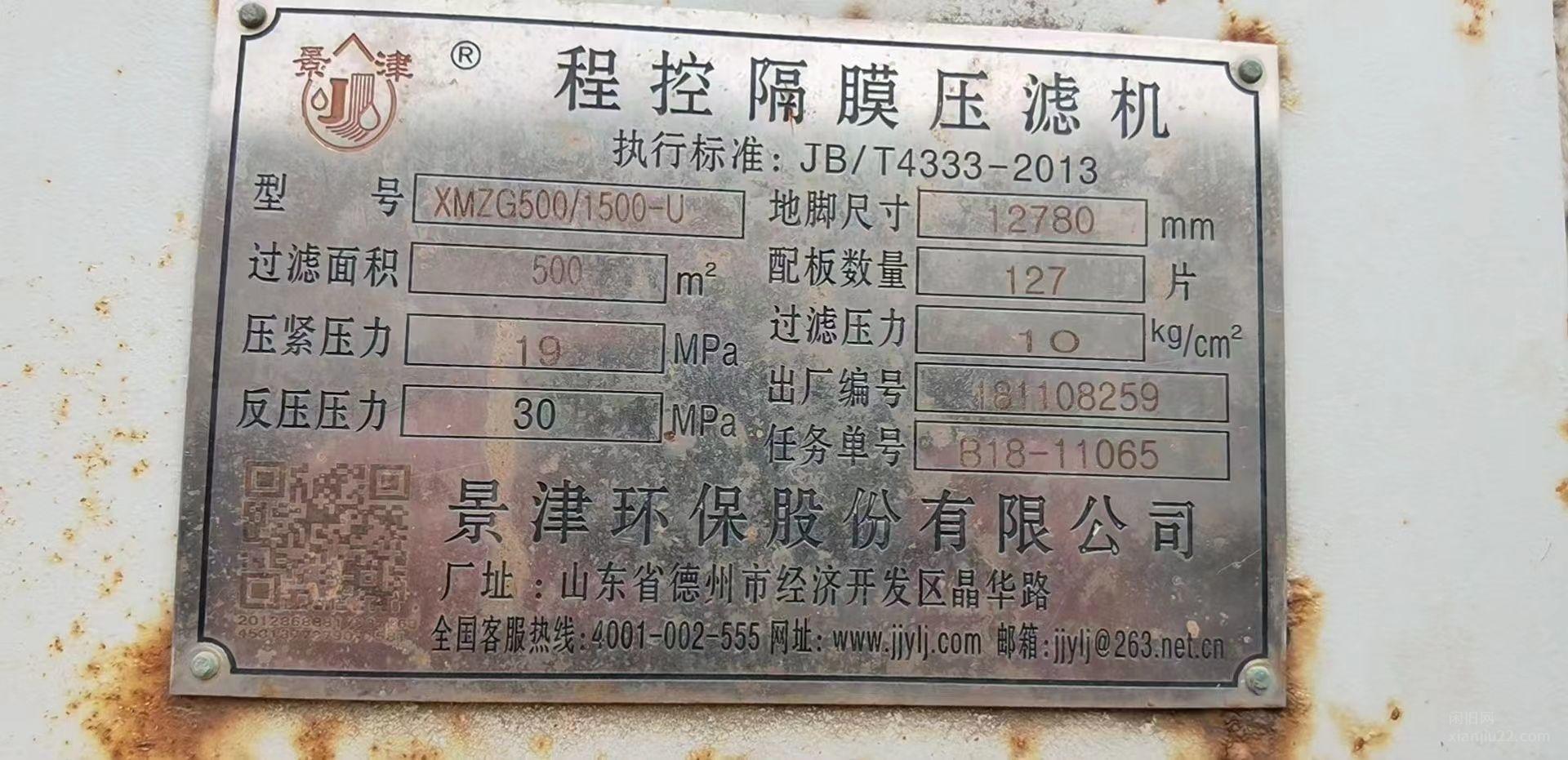 出售景津500平方压滤机
