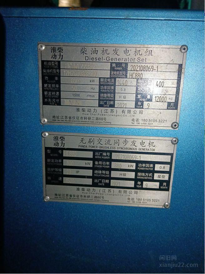 企业出售闲置2021年8月HC-WLZZ880淮柴柴油发电机组