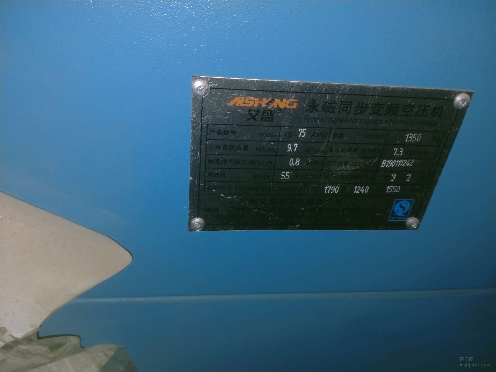 出售艾盛永磁变频螺杆空压机,55千瓦,配有两个储气罐和75A冷冻式干燥机