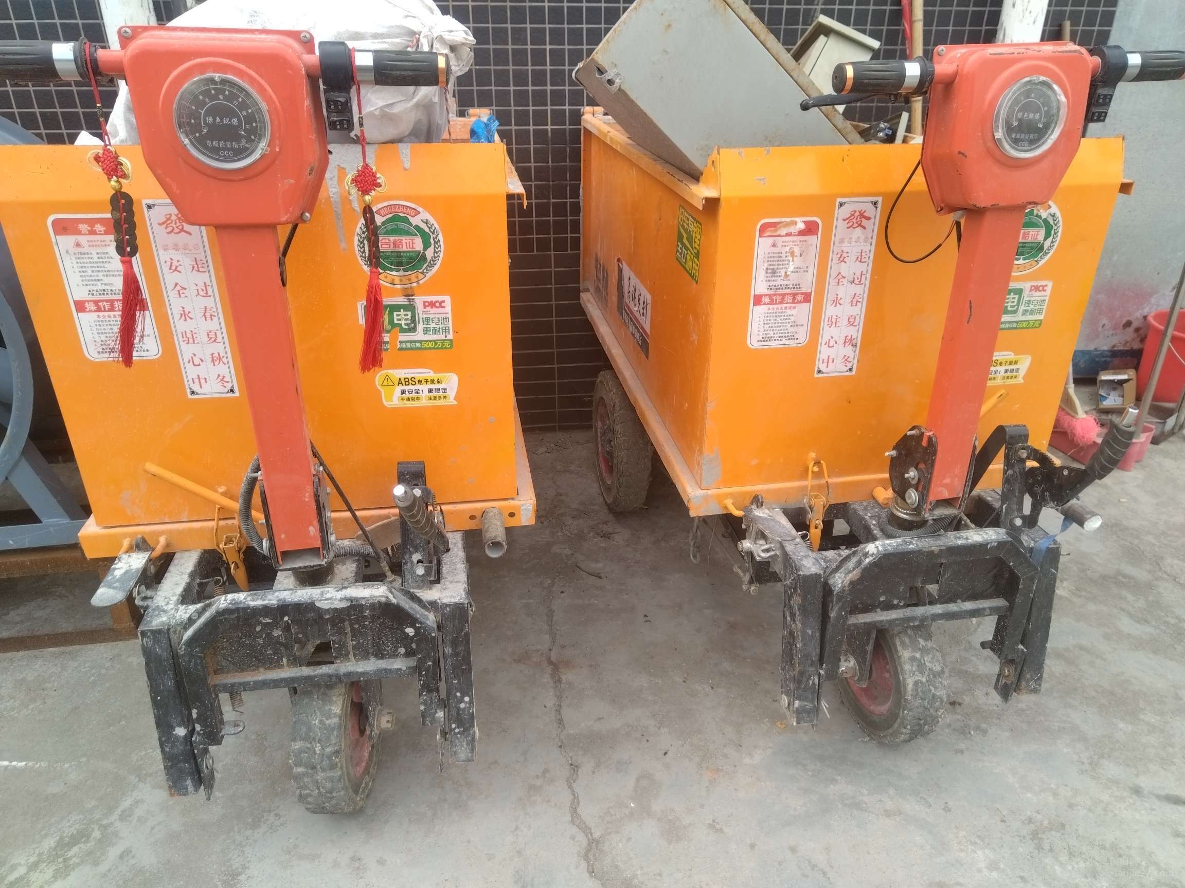 工地专用电动翻斗车,橙色车身,带电压表显示,动力强劲